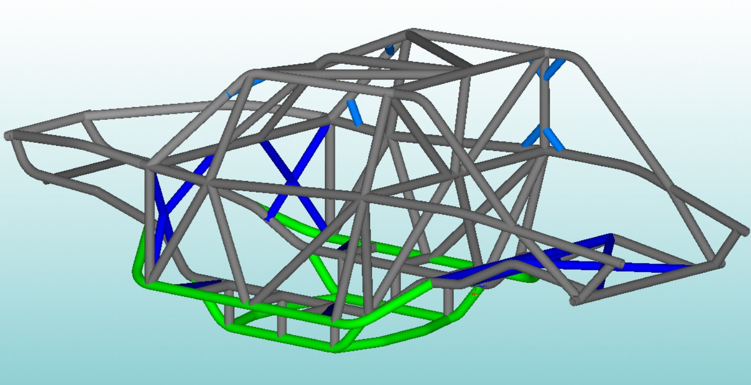 - ALL DOM (drawn over mandrel) Tube Constriction (Mild Steel)- 2” x .188 wall thickness sub frame, and rocker rails (tubes shown in bright green on the drawings). The remainder of chassis is built out of 2” x .120 wall thickness tubing (shown in grey on the drawings), and 1.75" x .120 wall thickness tubes for the window bars, and optional additional lacing/bracing tubes (shown in royal blue on the drawings)