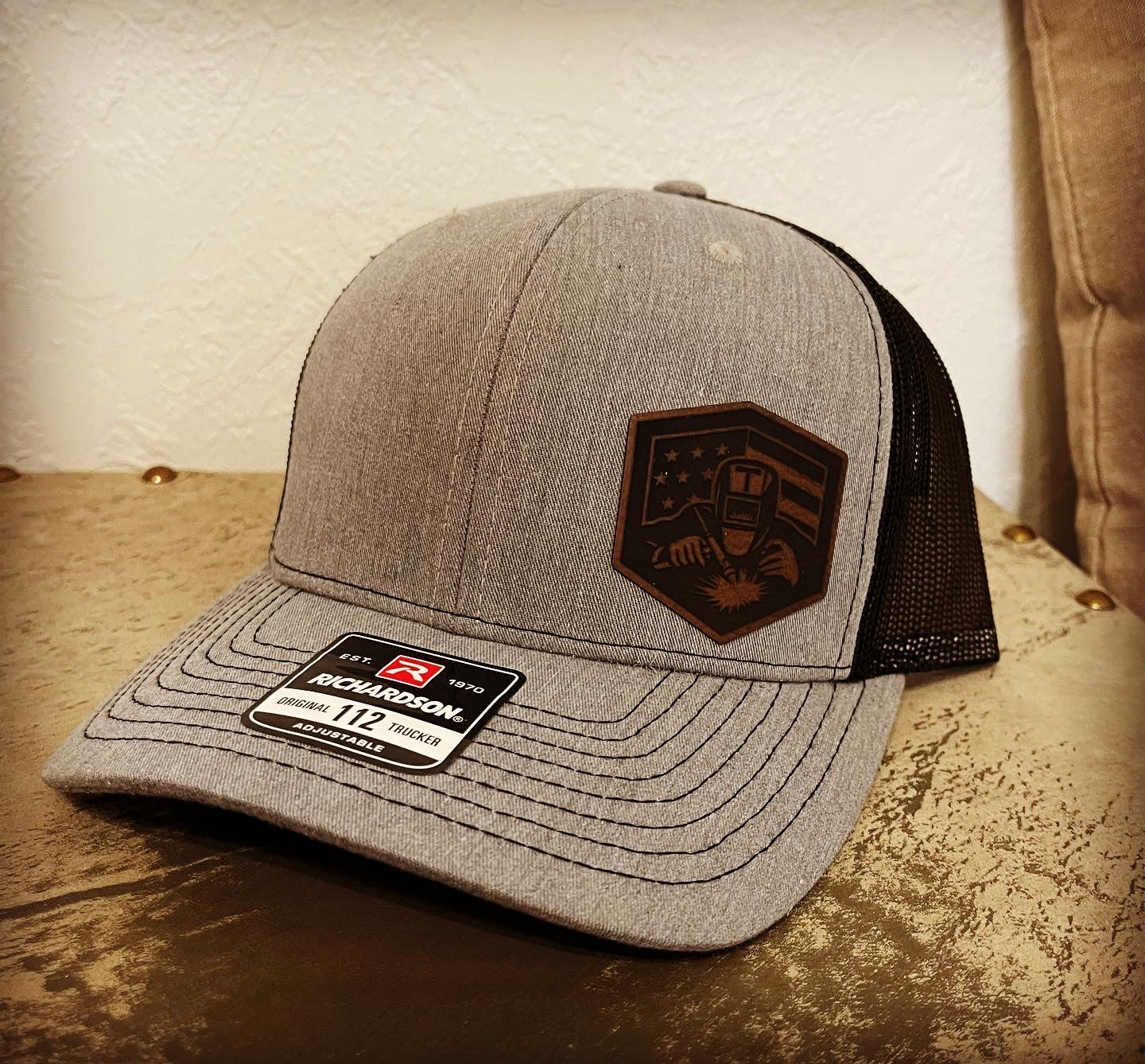 Featuring leatherette heat pressed patches.