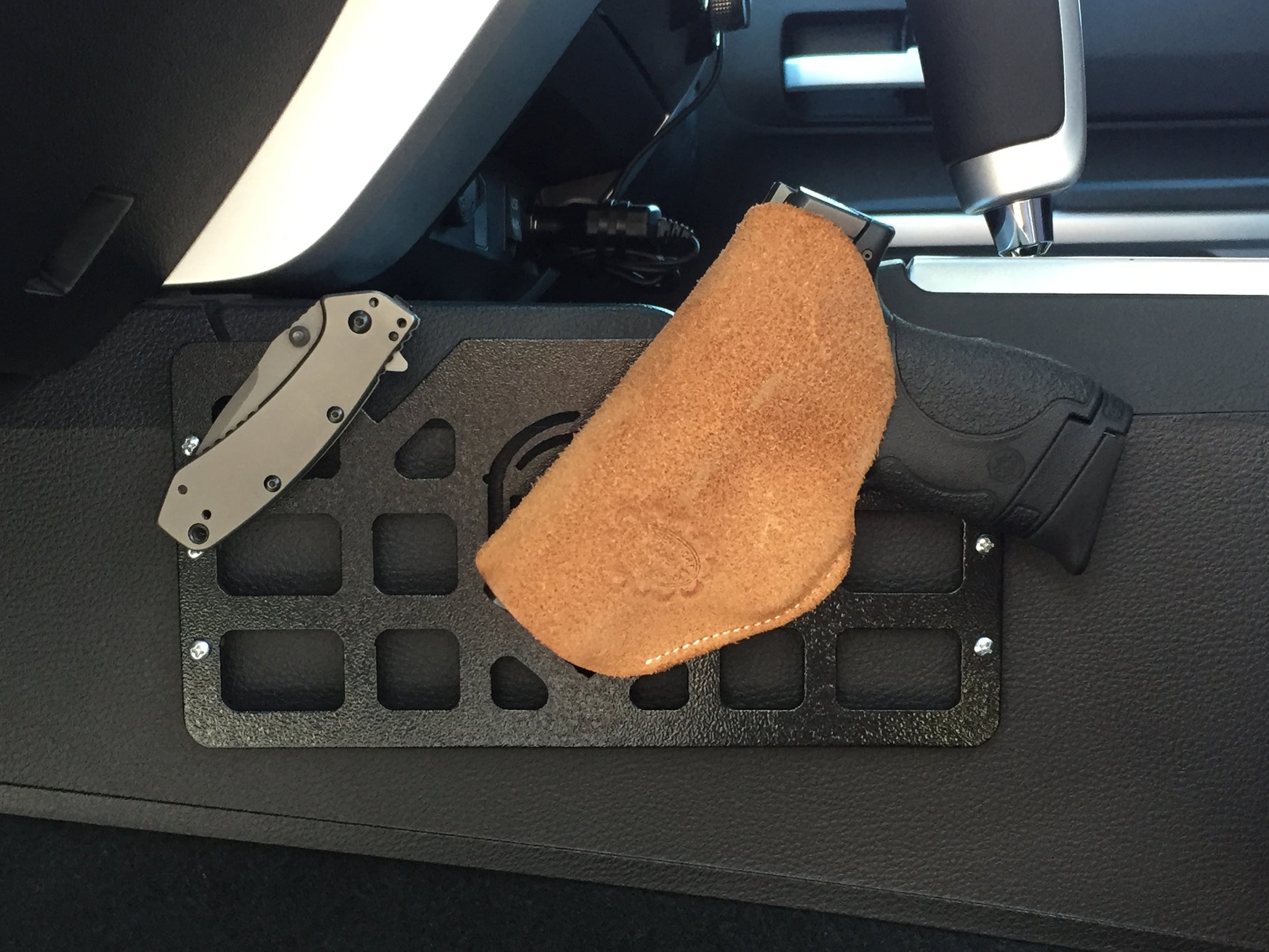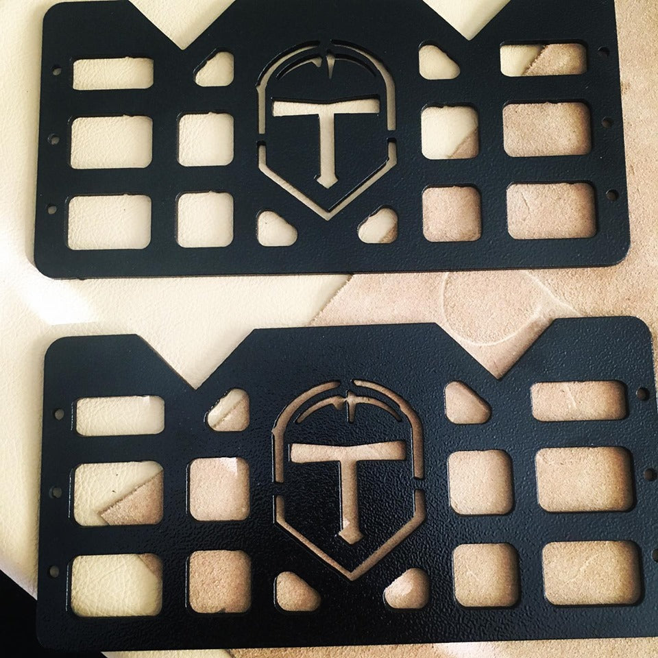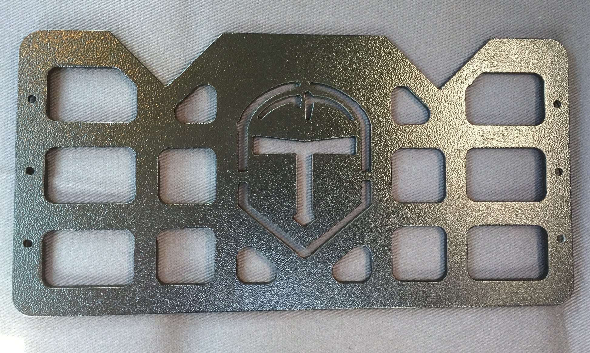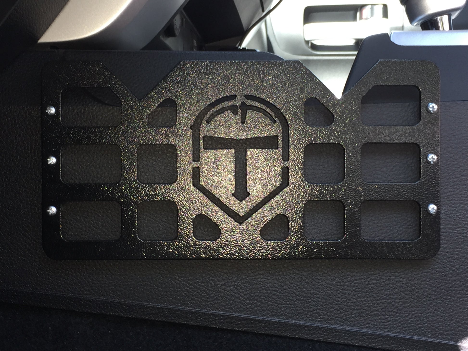 The "TACrac" is a rigid tactical style grid panel that can be mounted virtually anywhere. A versatile way to easily organize your essentials. Simply clip or tie your equipment on. (Holster, knife, flashlight). Made out of plasma cut 1/8” mild steel, with a durable hammered black powder coat finish. Shown here mounted in a Toyota Tundra, (drivers side console)