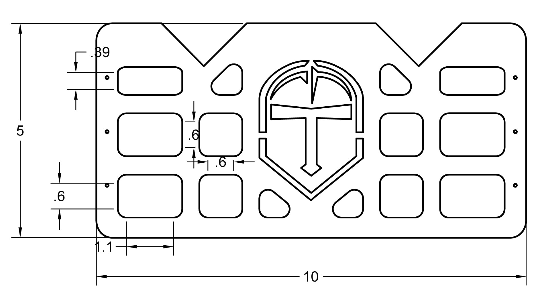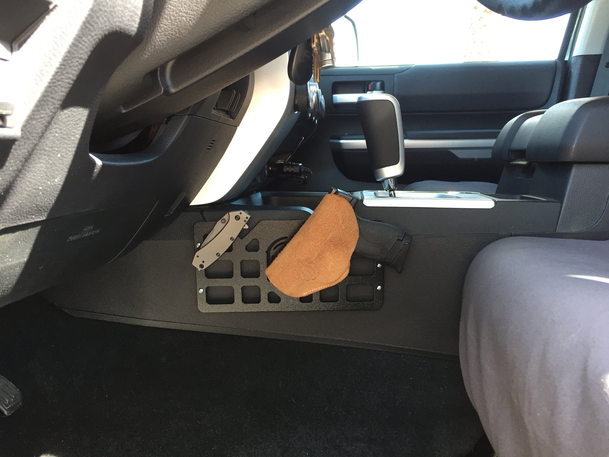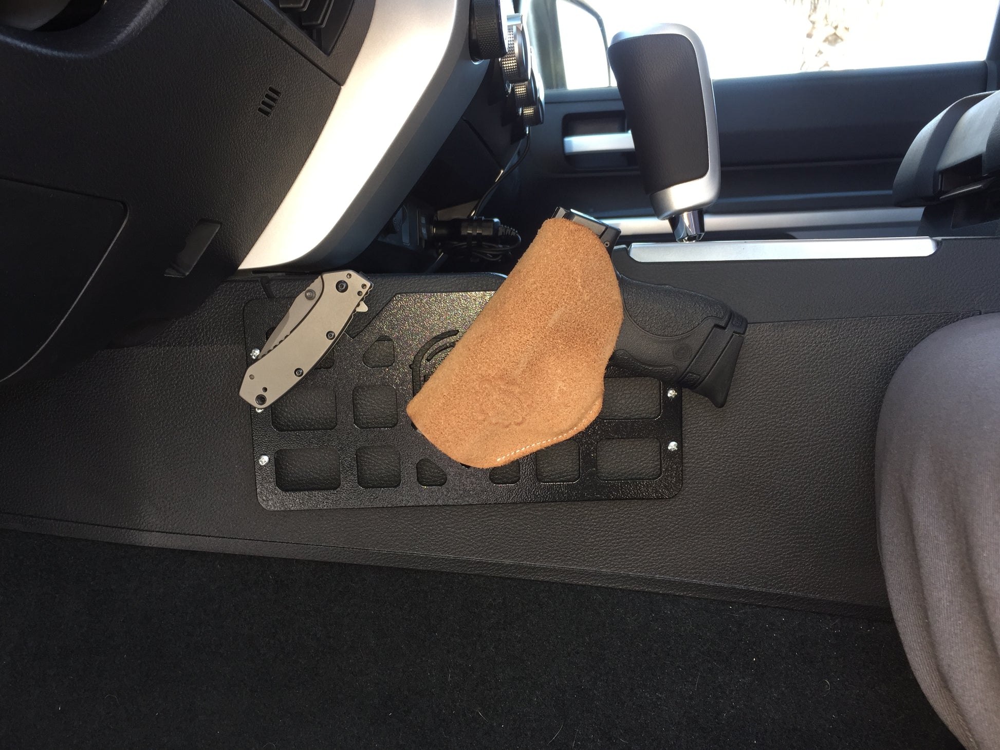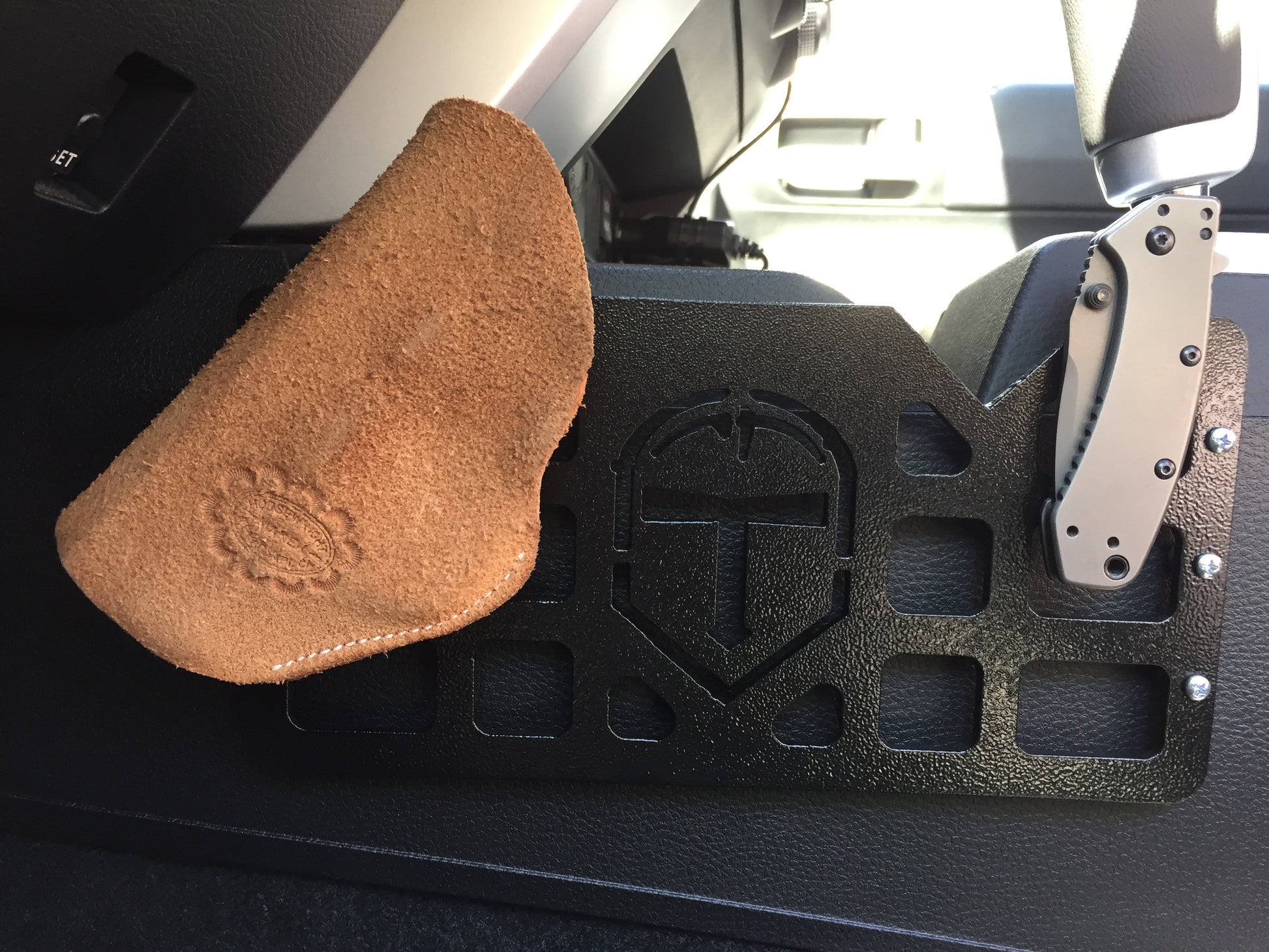 The "TACrac" is a rigid tactical style grid panel that can be mounted virtually anywhere. A versatile way to easily organize your essentials. Simply clip or tie your equipment on. (Holster, knife, flashlight). Made out of plasma cut 1/8” mild steel, with a durable hammered black powder coat finish. Shown here mounted in a Toyota Tundra, (drivers side console)